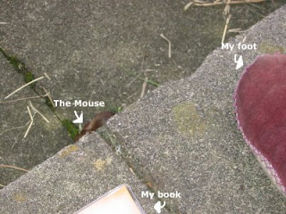 I was quite tired on Friday so I took a break in the afternoon and sat in the garden for a while. Charlie was in his run, but he wasn't my only company. A woodmouse also appeared. We have them occasionally - woe betide them if they come in the house - but they generally seem very bold. I usually dub them 'Woody' but this one had reddish fur so has been called 'Rusty' (by me - Andy doesn't do mice).